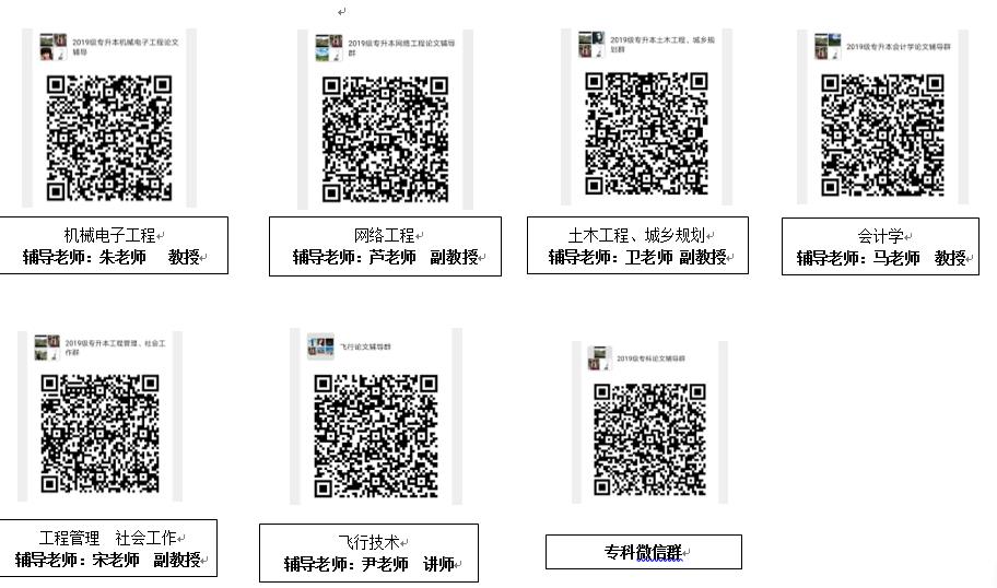 专升本:学生扫描自己所对应的专业群,学生进群以后以学号+姓名+专业命名,不以规定命名的直接清理出群。辅导老师会在3月中旬左右进行毕业生论文写作规范讲解及论文修改时间安排,须按规定时间及内容自行完成论文写作,由各专业辅导老师通过微信群通知如何修改论文。