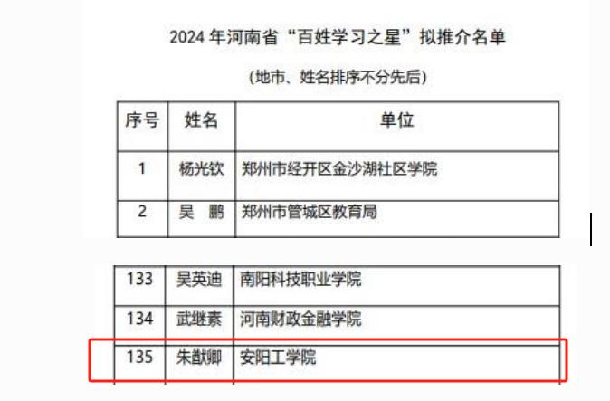 近日,河南省教育厅办公室《关于2024年河南省“百姓学习之星”“终身学习品牌项目”拟推介名单的公示》,我校退休职工朱猷卿同志被推介为2024年度河南省“百姓学习之星”。